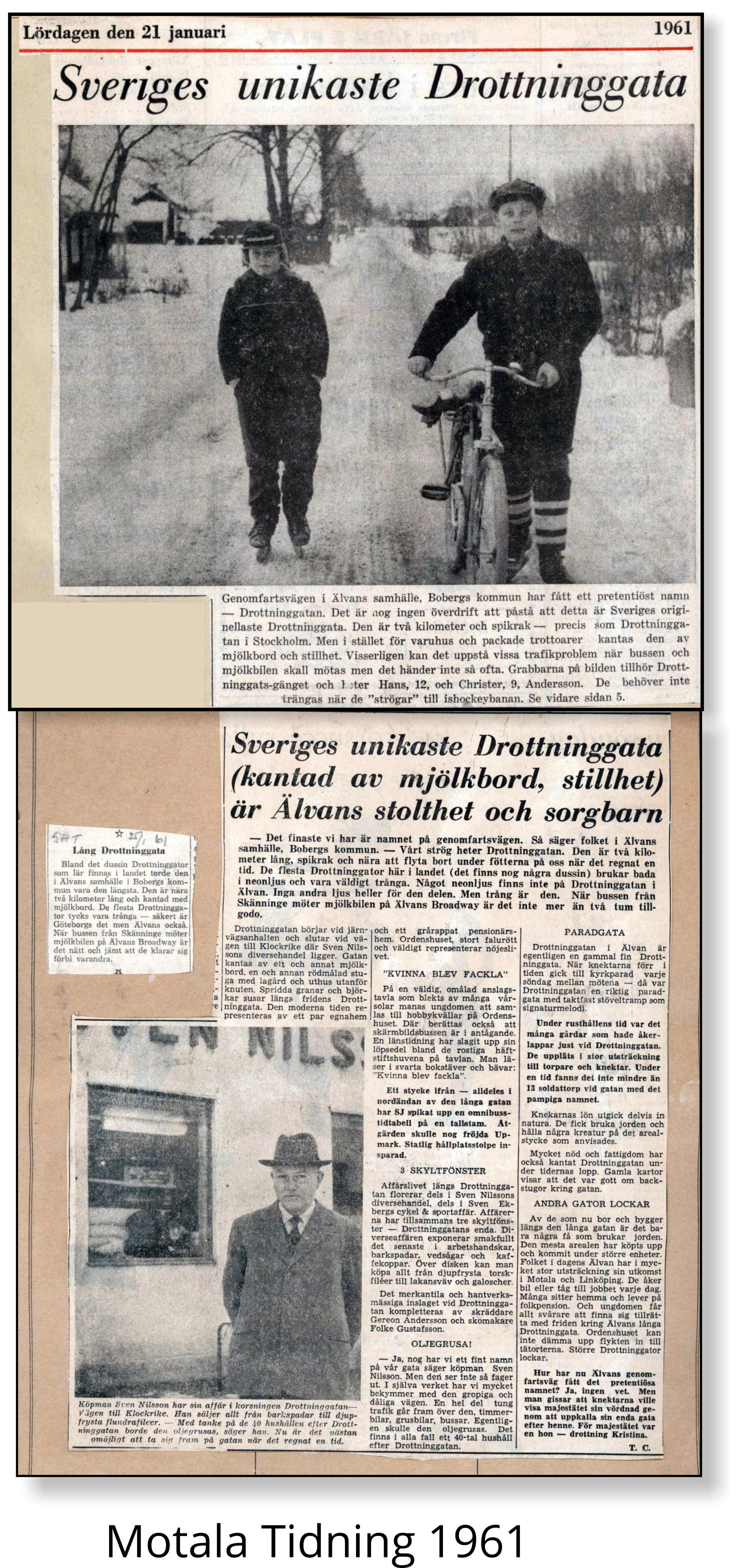 Bild över Drottninggatan från tidningen “Vi” från 1961, i ett reportage om en tågresa mellan Linköping och Vadstena. Ur artikeln: “Banan viker av mot väster och jag undrar varifrån den prydliga stationen i skogen har fått sitt sagonamn? Härifrån går en snörrät landsväg mot söder, kantad av röda hus, som kallas för Drottninggatan. Enligt traditionen lät drottning Kristina skifta utmarken här i skogen till torp och sa till om vägen.” Läs artikeln i “Bok 1958-1961” sid 76.