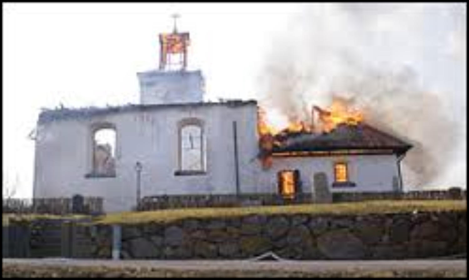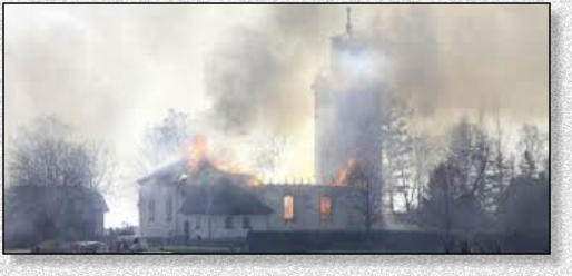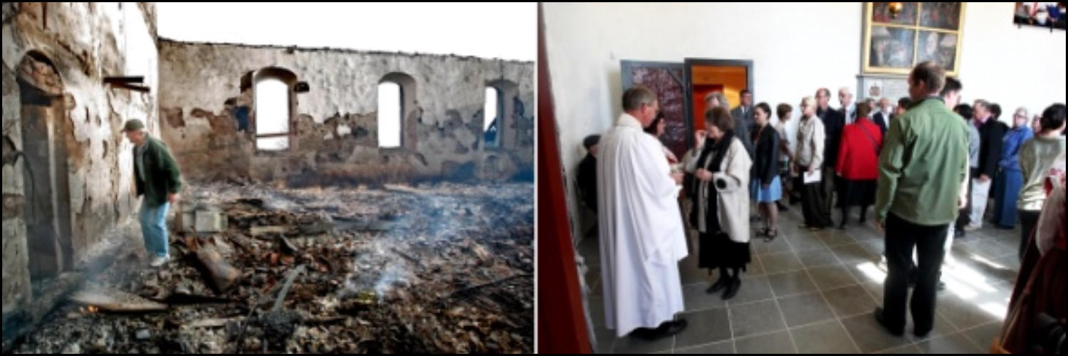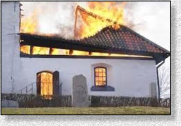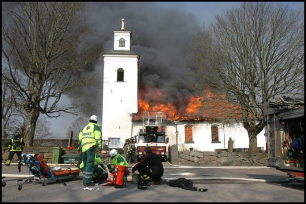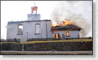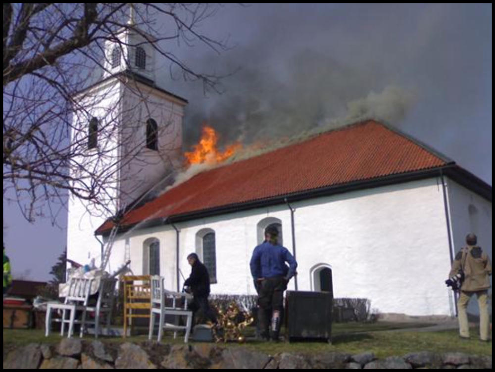 sprutade vatten mot taket övertändes kyrkan och taket rasade in (se länk). Det hördes en explosion samtidigt som ett eldklot
