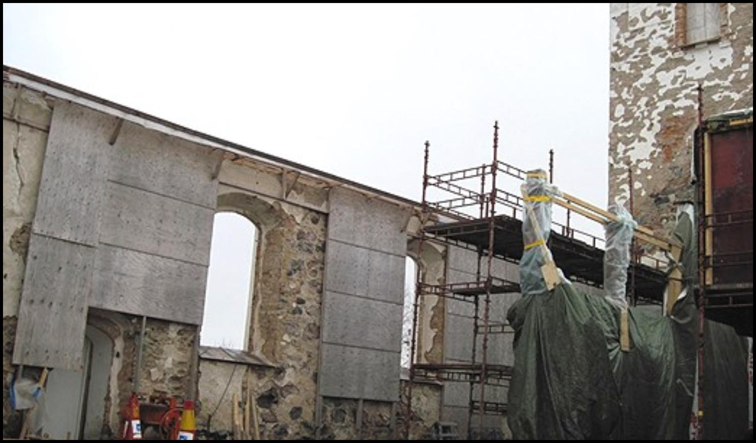 Tegel och huggen sten efter rivningen, togs tillvara och skolungdomar hjälpte under sommarlovet 2009 till att göra dem rena från murbruk så att de kan användas vid återuppbyggnaden. En del av